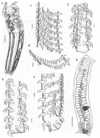 Atlanltic. a. Scolex. b. Internal surface. basal armature. c-d. Antibothrial surface. metabasal armature. e. Bothrial surface, basal armature. f. External surface, melabasal armature. g. Mature segment. Scale bars: a, g, 100; b-f 10.