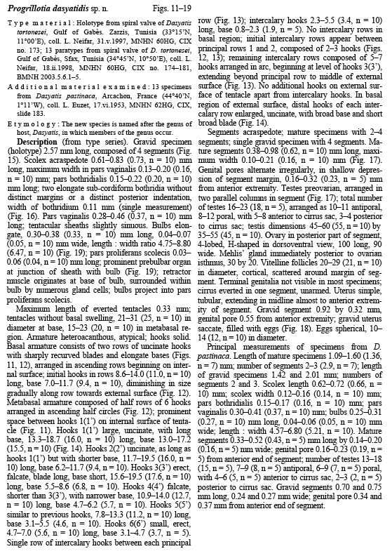 Beveridge, I., L. Neifar, and L. Euzet. 2004. Review of the genus Progrillotia Dollfus, 1946 (Cestoda: Trypanorhyncha), with a redescription of Progrillotia pastinacae Dollfus, 1946 and description of Progrillotia dasyatidis sp. n.. Folia Parasitologica 51(1): 33-44. (4269) Download PDF |