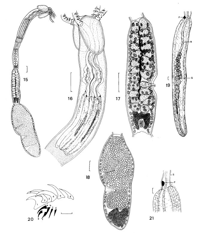 Figs. 15–19. Segments of Progrillotia dasyatidis sp. n. from Dasyatis tortonesei. Fig. 15. Entire cestode. Fig. 16. Scolex. Fig. 17. Pre-mature segment. Fig. 18. Gravid segment. Fig. 19. Bulb showing prebulbar organ (P) and gland cells (G) within bulb attached to retractor muscle (R). Figs. 20, 21. Progrillotia louiseuzeti Dollfus, 1969, drawn from holotype. Fig. 20. Hooks of principal row and intercalary rows showing 6 hooks in principal row and intercalary rows composed of 4 and 2 spiniform hooks, respectively. Fig. 21. Junction of sheath (S) with bulb showing prebulbar organ (P). Scale bars: Figs. 15–18 = 0.1 mm; Figs. 19–