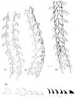 Figs. 11–14. Tentacular armature of Progrillotia dasyatidis sp. n. from Dasyatis tortonesei. Fig. 11. Basal and metabasal tentacular armature, internal surface of tentacle. Fig. 12. Basal and metabasal armature, antibothridial surface of tentacle. Fig. 13. Basal and metabasal tentacular armature, external surface. Fig. 14. Profiles of hooks 1(1’) to 6(6’) from the principal rows and intercalary row near the base of the tentacle. Intercalary hooks are shown in black. Hooks of principal rows are numbered 1–6 on
