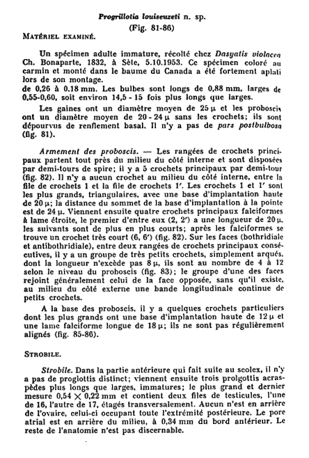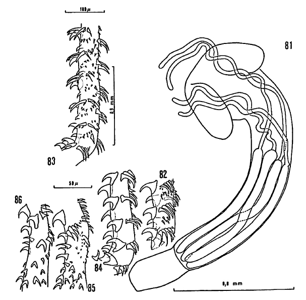 FIG. 81. - Progrillotia louiseuzeti n. sp., de Dasyatis violacea Ch. Bonaparte, 1832. Scolex. FIG. 82. - Armement métabasal vu par une face. FIG. 83. - Armement métabasal vu par le côté externe. FIG. 84. - Autre aspect de l‘armement métabasal, le côté externe est à droite. FIG. 85 et 86. - Région basale de deux proboscis, pour montrer la forme particulière des crochets de la base.