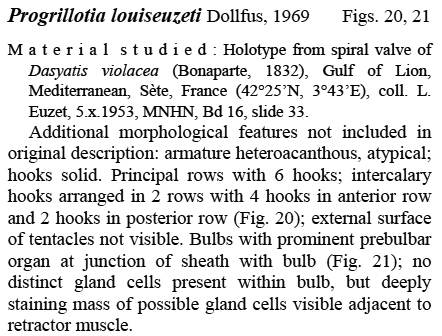 Beveridge, I., L. Neifar, and L. Euzet. 2004. Review of the genus Progrillotia Dollfus, 1946 (Cestoda: Trypanorhyncha), with a redescription of Progrillotia pastinacae Dollfus, 1946 and description of Progrillotia dasyatidis sp. n.. Folia Parasitologica 51(1): 33-44. (4269) Download PDF |