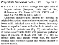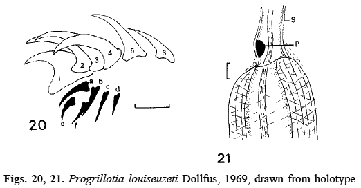 Figs. 20, 21. Progrillotia louiseuzeti Dollfus, 1969, drawn from holotype. Fig. 20. Hooks of principal row and intercalary rows showing 6 hooks in principal row and intercalary rows composed of 4 and 2 spiniform hooks,