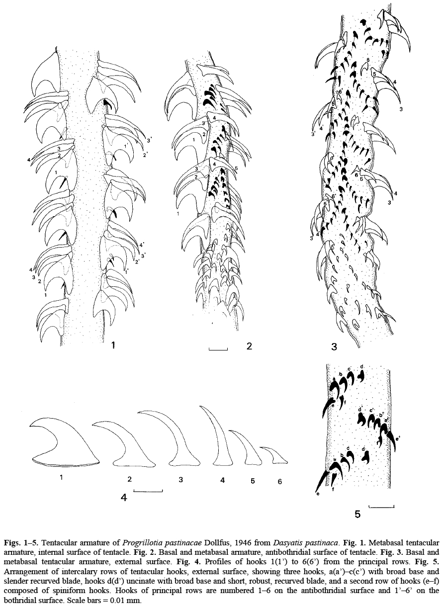 Figs. 15. Tentacular armature of Progrillotia pastinacae Dollfus, 1946 from Dasyatis pastinaca. Fig. 1. Metabasal tentacular