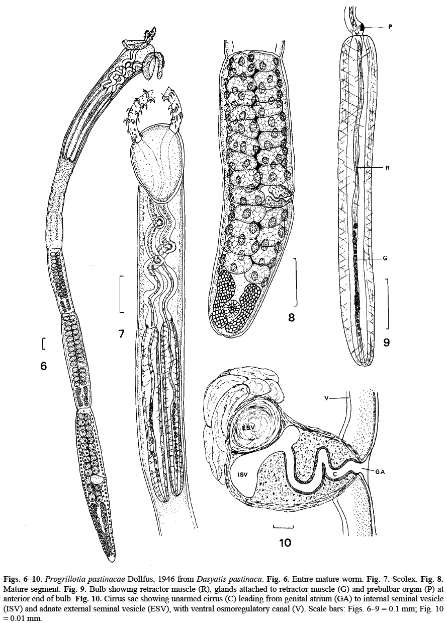 Figs. 610. Progrillotia pastinacae Dollfus, 1946 from Dasyatis pastinaca. Fig. 6. Entire mature worm. Fig. 7. Scolex. Fig. 8. Mature segment. Fig. 9. Bulb showing retractor muscle (R), glands attached to retractor muscle (G) and prebulbar organ (P) at