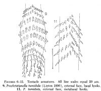 FIGURES 6-12. Tentacle armatures. All line scales equal 20 µm. 9. Prochristianella tumidula (Linton 1890), external face, basal hooks. 11. P. tumidula, external face, metabasal hooks.