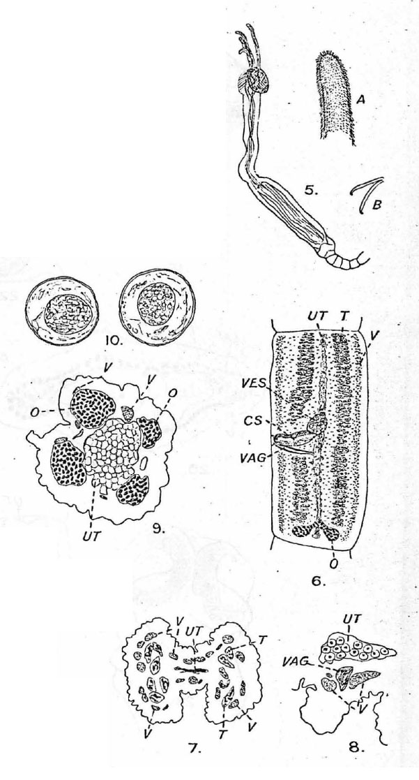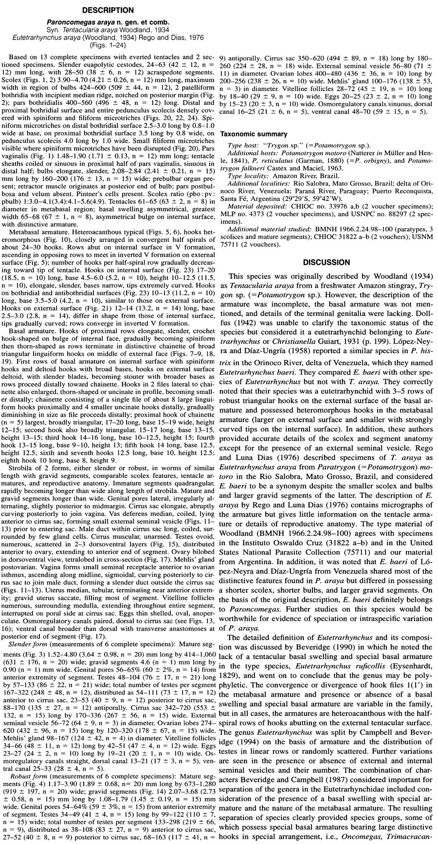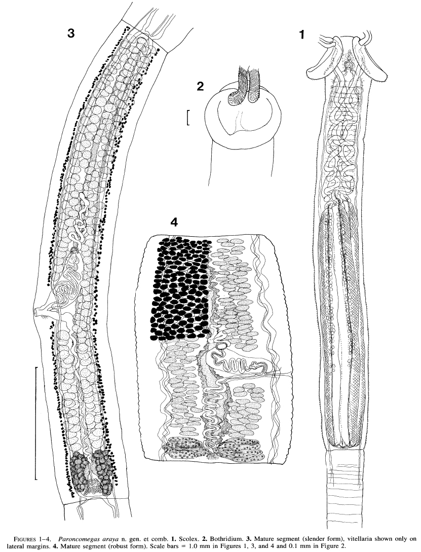 FIGURES 1 -4. Paroncomegas araya n. gen. et comb. 1. Scolex. 2. Bothridium. 3. Mature segment (slender form), vitellaria shown only on lateral margins. 4. Mature segment (robust form). Scale bars = 1.... MoreFIGURES 1 -4. Paroncomegas araya n. gen. et comb. 1. Scolex. 2. Bothridium. 3. Mature segment (slender form), vitellaria shown only on lateral margins. 4. Mature segment (robust form). Scale bars = 1.0 mm in Figures 1, 3, and 4 and 0.1 mm in Figure 2. |