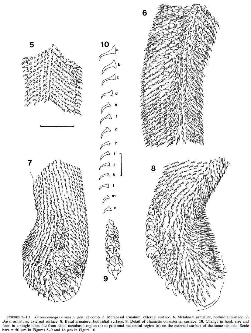 Basal armature, external surface. 8. Basal armature, bothridial surface. 9. Detail of chainette on external surface. 10. Change in hook size and form in a single hook file from distal metabasal region (a) to proximal metabasal region (n) on the external surface of the same tentacle. Scale bars = 50 µm n Figures 5-9 and 16 µm Figure 10. |