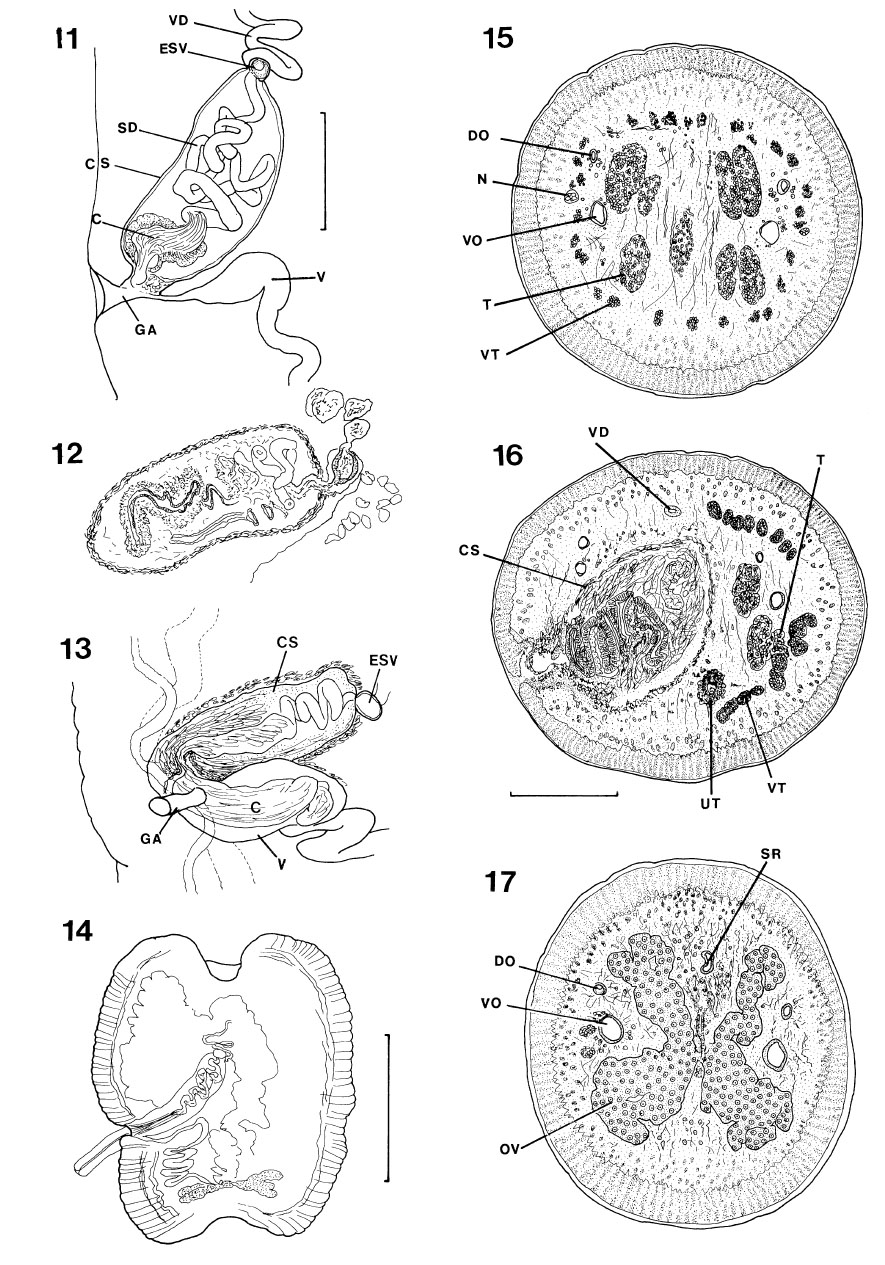 FIGURES 11-17. Paroncomegas araya n. gen. et comb. 11. Detail of terminal genitalia. 12. Cirrus sac (frontal section). 13. Detail of terminal genitalia in self-fertilization. 14. Gravid segment. 15. C... MoreFIGURES 11-17. Paroncomegas araya n. gen. et comb. 11. Detail of terminal genitalia. 12. Cirrus sac (frontal section). 13. Detail of terminal genitalia in self-fertilization. 14. Gravid segment. 15. Cross section through mature segment at level of testes. 16. Cross section through mature segment at level of cirrus sac. 17. Cross section through mature segment at level of ovarian isthmus. Scales bars = 0.2 mm in Figures 11-13, 15-17 and 1 mm in Figure 14. Abbreviations: C, cirrus; CS, cirrus sac; DO, dorsal osmoregulatory canal; ESV, external seminal vesicle; GA, genital atrium; MD, male duct; N, nerve cord; 0, ovary; SD, sperm duct; SR, seminal receptacle; T, testis; UT, uterus; V, vagina; VD, vas deferens; VO, ventral osmoregulatory canal; VT, vitelline follicles. |