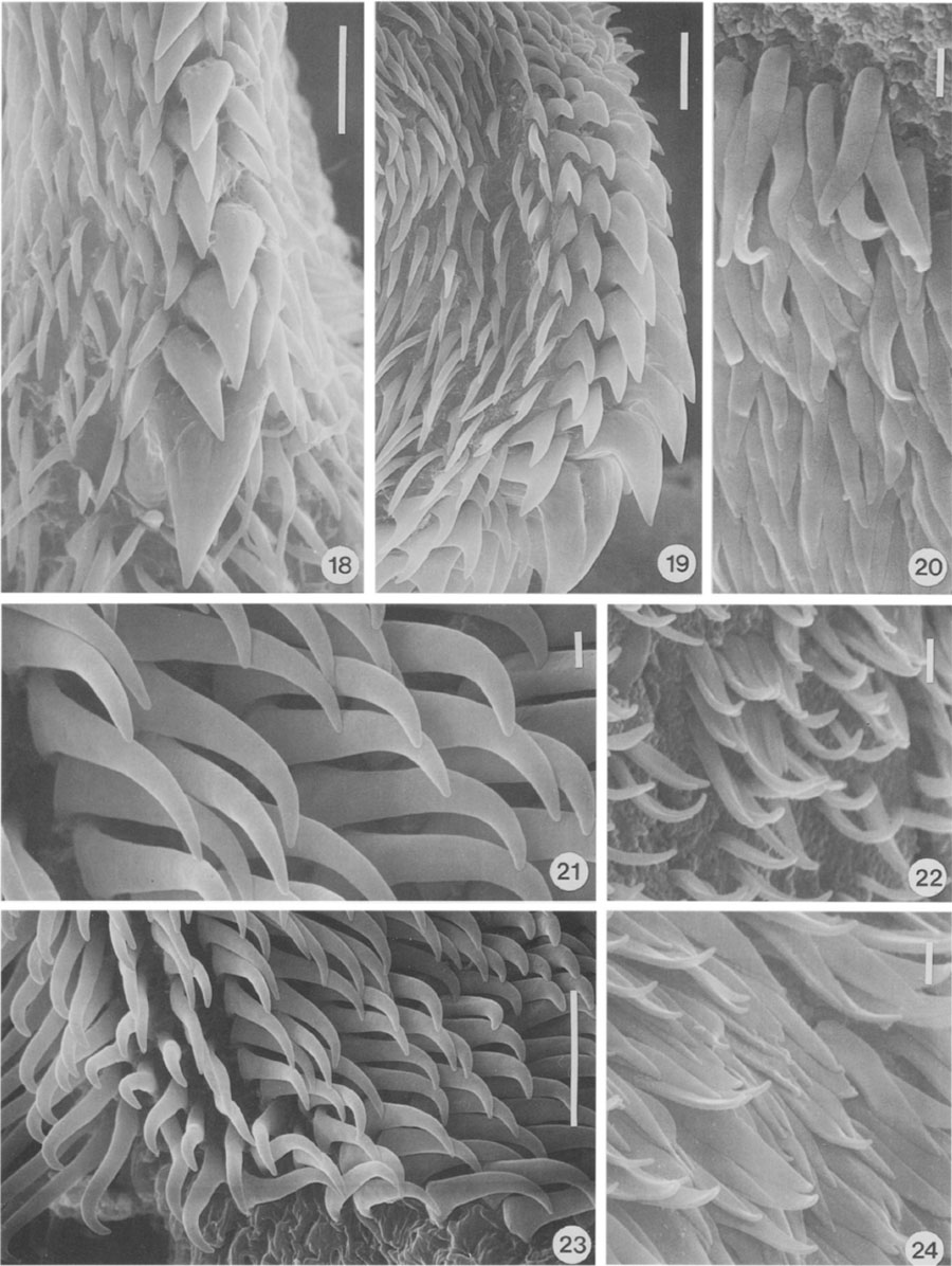 FIGURES 18-24. SEM of Paroncomegas araya n. gen. et comb. 18. External surface of basal armature showing chainette; note linguiform hooks in central file. 19. Bothridial surface of basal armature, cha... MoreFIGURES 18-24. SEM of Paroncomegas araya n. gen. et comb. 18. External surface of basal armature showing chainette; note linguiform hooks in central file. 19. Bothridial surface of basal armature, chainette at right; note uncinate form of hooks in files adjacent to central file of large hooks. 20. Distal surface of bothridium; note large spiniform microtriches and small filiform microtriches. 21. Detail of hooks on metabasal armature, bothridial face; note spiniform hooks. 22. Spiniform microtriches on proximal bothridial surface. 23. Metabasal armature, bothridial face; note contrasting shapes of hook tips on internal face (left) and external face (right). 24. Spiniform microtriches on pedunculus scolecis (absent from strobila). Scale bars = 10 [pm in Figures 18, 19, 23 and 1 p.m in Figures 20-22, 24. |