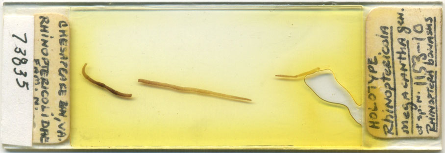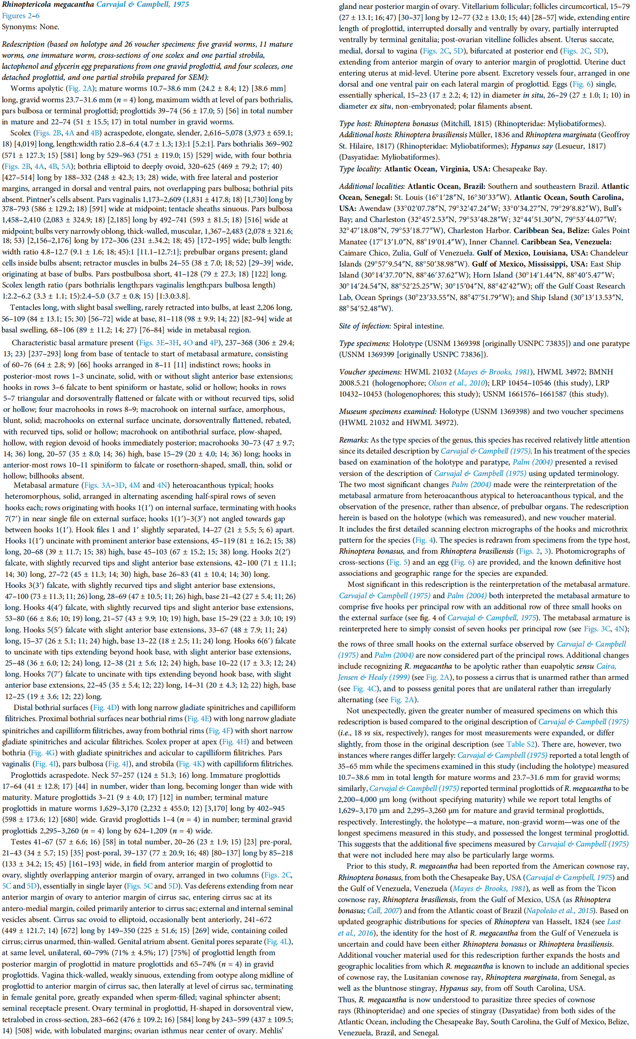 Carvajal, J. and R. A. Campbell. 1975. Rhinoptericola megacantha gen. et sp. n., representing a new family of trypanorhynch cestodes from the cownose ray, Rhinoptera bonasus (Mitchill, 1815). Journal of Parasitology 61(6): 1023-1030.