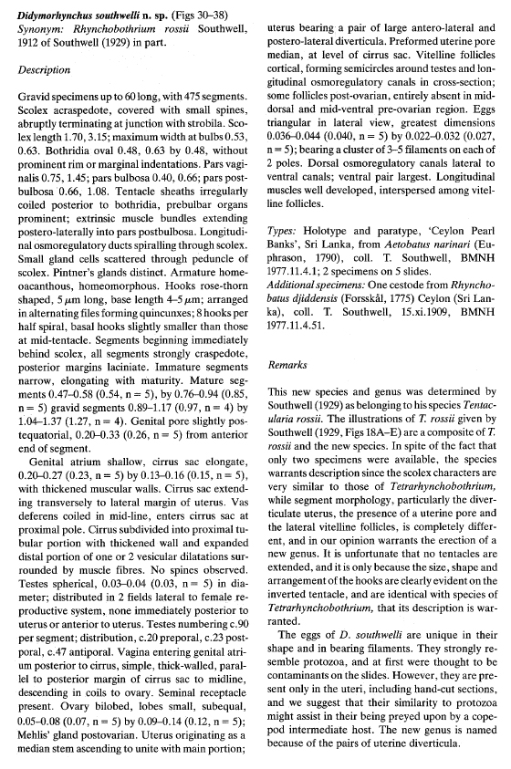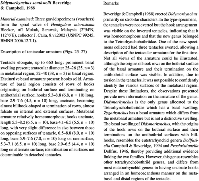 Beveridge, I. and R. A. Campbell. 1988. A review of the Tetrarhynchobothriidae Dollfus, 1969 (Cestoda: Trypanorhyncha) with descriptions of two new genera, Didymorhynchus and Zygorhynchus. Systematic Parasitology 12: 29-Mar.