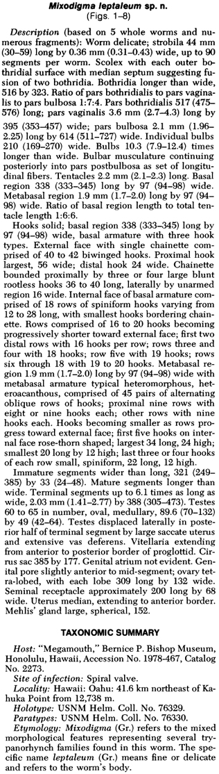 Dailey, M. D. and W. Vogelbein. 1982. Mixodigmatidae, a new family of cestode (Trypanorhyncha) from a deep sea planktonivorous shark. Journal of Parasitology 68(1): 145-149. (4284) Download PDF |