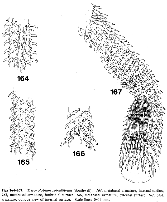 Figs 164-167. Trigonolobium spinuliferum (Southwell). 164, metabasal armature, internal surface; 165, metabasal armature, bothridial surface; 166, metabasal armature, external surface; 167, basal armature, oblique view of internal surface. Scale lines: 0.01 mm.