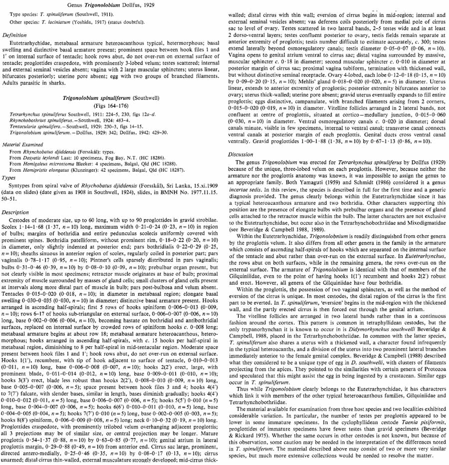 Southwell, T. 1911. Description of nine new species of cestode parasites, including two new genera from marine fishes of Ceylon. Ceylon Marine Biological Report 1: 216-225. (437) Download PDFDollfus, R.-P. 1929. Sur les Tetrarhynques. Definition des genres. Bulletin de la Societe Zologique de France 54: 308-342. (4381) Download PDF |