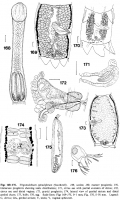 Figs 168-176. Trigonolobium spinuliferum (Southwell). 168, scolex; 169, mature proglottis; 170, immature proglottis showing testis distribution; 171, cirrus sac with partial eversion of cirrus; 172, cirrus sac and distal vagina; 173, gravid proglottis; 174, lateral view of genital atrium and distal genital ducts; 175, bulb; 176, egg. Scale lines: Figs 168-175, 0.1 mm; Fig. 176, 0.01 mm. Legend: C, cirrus; GA, genital atrium; T, testis; V, vaginal sphincter.