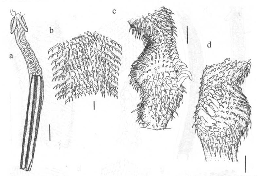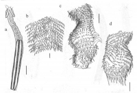 Fig. 223 a-d. Paroncomegas myliobatis sp. nov. from Myliobatis hamlyni, Indonesia. a. Scolex. b. External surface, metabasal armature. c. Antibothrial surface, basal armature. d. External surface, basal armature with chainette. Scale bars: a, 750; b, 20; c-d, 50.