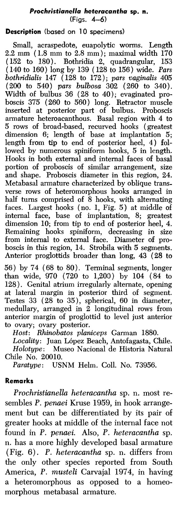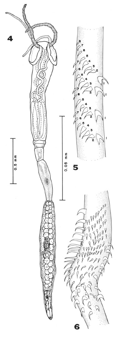 Figures 4-6. Prochristianella heteracantha sp. n. 4. Entire worm. 5. Metabasal armature-internal face. 6. Basal armature-internal face.