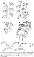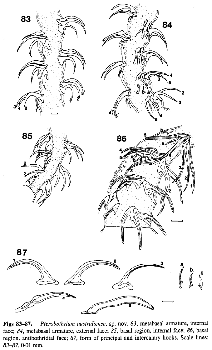 Figs 83-87. Pterobothrium australiense, sp. nov. 83, metabasal armature, internal face; 84, metabasal armature, external face; 85, basal region, internal face; 86, basal region, antibothridial face; 87, form of principal and intercalary hooks. Scale lines: 83-87,0.01 mm.
