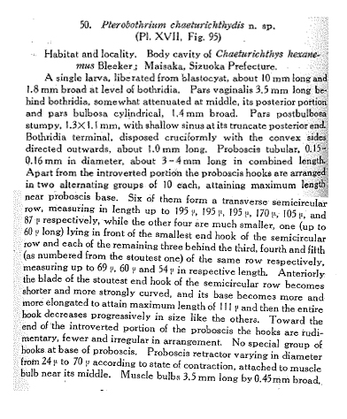 Yamaguti, S. 1952. Studies on the helminth fauna of Japan. Part 49. Cestodes of fishes, II. Acta Medicinae Okayama 8: 1-76.