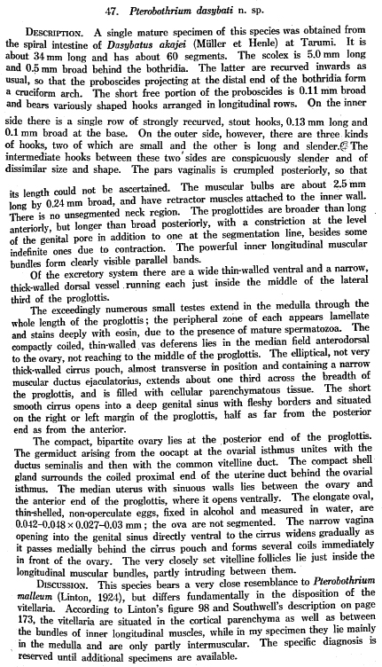 Yamaguti, S. 1934. Studies on the helminth fauna of Japan. Part 4. Cestodes of fishes. Japanese Journal of Zoology 6: 1-112. (510) Download PDF |