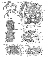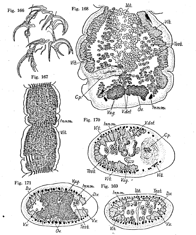 Fig. 166. Hooks at about middle of proboscis. Fig. 167. Mature segments in surface view. Fig. 168. Frontal section of gravid segment. Fig. 169-171. Transverse sections of same.