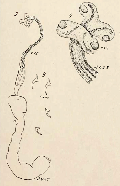 Plate XV. Figs. 2-4. Syndesmobothrium filicolle, sp. nov. Fig. 2. Sketch of alcoholic specimen, x15. The specimen is immature and the posterior part a is evidently a blastocyst from which the anterior part or scolex has been everted. Fig. 3. Hooks, the smaller ones from the base, the larger from the middle of a proboscis, x200. Fig. 4. View of top of head, from alcoholic specimen, x50.