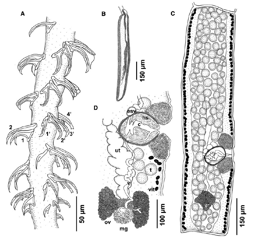 Fig. 4 Pterobothrium lesteri from Gymnura poecilura. A. Tentacular armature, basal to metabasal region, antibothrial surface; B. Bulb; C. Mature segment; D. Terminal genitalia, diagrammatic view. Abbreviations: c, cirrus; esv, external seminal vesicle; hs, hermaphroditic sac; mg, Mehlis' gland; ov, ovary; t, testis; ut, uterus; v, vagina; vit, vitelline follicle.