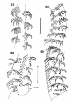 Figs 52-55. Pterobothrium lesteri, sp. nov. 52, internal face, metabasal region; 52, bothridial face, metabasal region; 54, external face, basal region; 55, antibothridial face, basal region (note first row at base of tentacle, arrow). Scale lines: 52-55, 0.1mm.