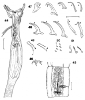 Figs 44-51. Pterobothrium lesteri, sp. nov., from Gymnura micrura. 44, scolex; 45, immature segment (vitellaria not shown); 46, basal armature, first row of hooks; 47, principal hooks 1-5 near tip of tentacle; 48, principal hooks 1-5 from proximal metabasal region; 49, variations of hooks 5(5') from metabasal region; 50, band hooks from external face; 51, intercalary hooks (a-c). Scale lines: 44, 0.5 mm; 45, 0.1 mm; 46-51, 0.045 mm.