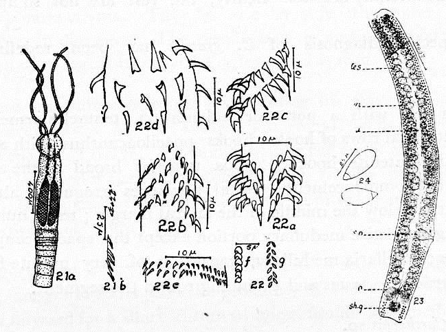 Figs. 21-22. Eulacistorhynchus chiloscyllius, g. n. & sp. n. 21a. Scolex. fig. 21b. Spines of bothria and the rest of scolex. fig. 22a. Tentacular hooks about the middle, internal view. fig. 22b. The same, external view. fig. 22c. The same, lateral view. fig. 22d. Tentacular hooks at the base. fig. 22e. Tentacular hooks just above the base. fig. 22f. Hooks of the chainette as seen a little above the base. fig. 22g. The same further above the base. fig. 23. Mature segment, vitellaria in the lateral field alone are shown, except at the anterior end. fig. 24. Uterine eggs.