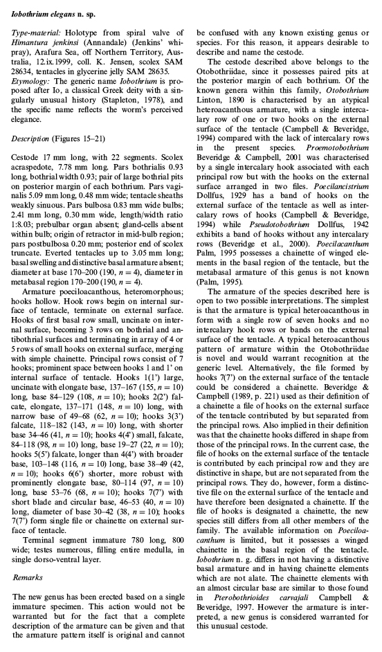 Beveridge, I. and R. A. Campbell. 2005. Three new genera of trypanorhynch cestodes from Australian elasmobranch fishes. Systematic Parasitology 60: 211-224. (4310) Download PDF |