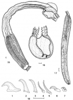 margin. 17. Bulb. 18. Profiles of tentacular hooks 1–7. Scale-bars: 0.1 mm.
