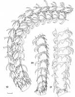 Figures 19–21. Iobothrium elegans n. g., n. sp. Tentacular armature. 19. Basal and metabasal regions, external surface. 20. Basal and