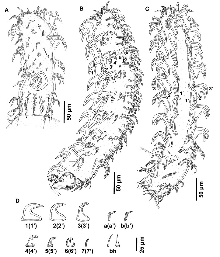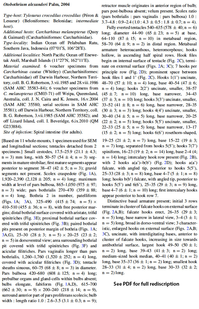 Fig. 2 Otobothrium alexanderi Palm, 2004 from Carcharhinus cautus in the Timor Sea (A) and from C. Melanopterus in the Arafura Sea (B-D). A, basal tentacular armature, external surface; B, basal and m... MoreFig. 2 Otobothrium alexanderi Palm, 2004 from Carcharhinus cautus in the Timor Sea (A) and from C. Melanopterus in the Arafura Sea (B-D). A, basal tentacular armature, external surface; B, basal and metabasal tentacular armature, bothrial surface; C, basal and metabasal tentacular armature, internal surface; D, profiles of tentacular hooks. Abbreviation: bh, basal tentacular hooks on external surface in lateral (left) and dorsal view (right). |