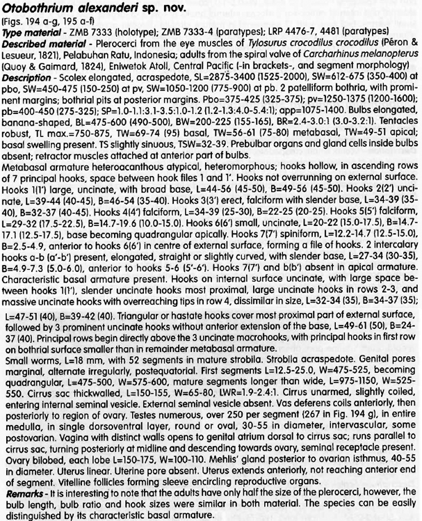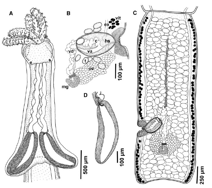 Fig. 1 Otobothrium alexanderi Palm, 2004 from Carcharhinus melanopterus in the Arafura Sea. A, scolex, dorso-ventral view; B, detail of terminal genitalia; C, mature segment; D, bulb. Abbreviations: c... MoreFig. 1 Otobothrium alexanderi Palm, 2004 from Carcharhinus melanopterus in the Arafura Sea. A, scolex, dorso-ventral view; B, detail of terminal genitalia; C, mature segment; D, bulb. Abbreviations: c, cirrus; ex, excretory canal; hs, hermaphroditic sac; mg, Mehlis' gland; ov, ovary; t, testis; va, vagina; vd, vas deferens; vit, vitelline follicle |