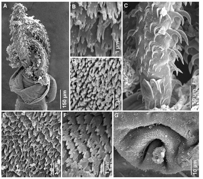 Fig. 3 Scanning electron micrographs of Otobothrium alexanderi Palm, 2004 from Carcharhinus melanopterus in the Timor Sea. A, anterior region of scolex, dorso-ventral to lateral view; B, proximal both... MoreFig. 3 Scanning electron micrographs of Otobothrium alexanderi Palm, 2004 from Carcharhinus melanopterus in the Timor Sea. A, anterior region of scolex, dorso-ventral to lateral view; B, proximal bothrial surface showing trifid spinitriches; C, basal and metabasal tentacular armature, external surface, note: characteristic group of three hooks; D, acicular filitriches covering pars vaginalis; E, distal bothrial surface showing aristate, trifid spinitriches; F, trifid spinitriches surrounding area of bothrial pit; G, posterior bothrial margin showing bothrial pit |