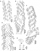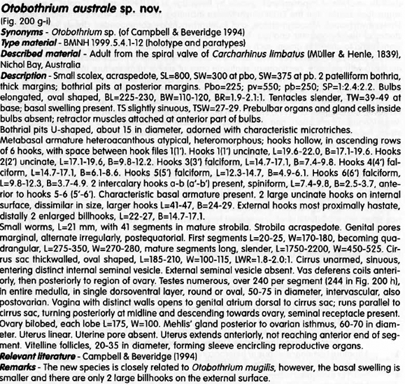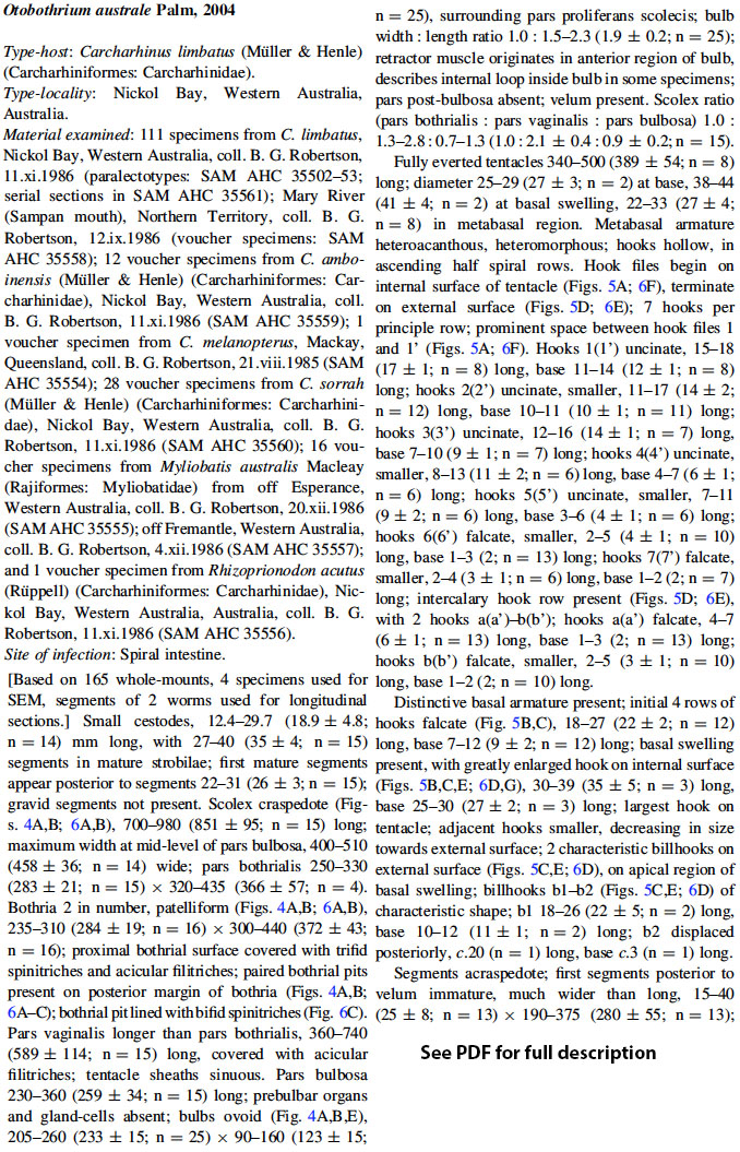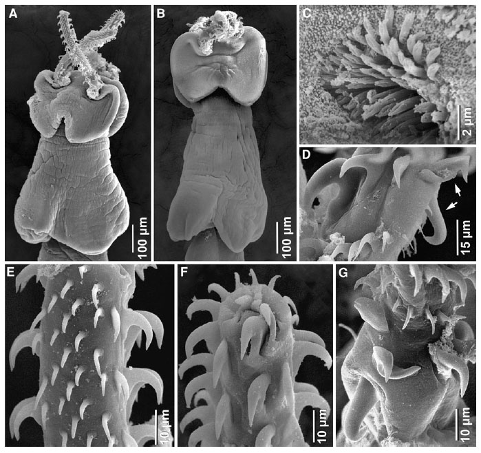Fig. 6 Scanning electron micrographs of Otobothrium australe, Palm, 2004 from Carcharhinus limbatus in the Indian Ocean. A, scolex, dorso-ventral to lateral view; B, scolex, dorso-ventral view; C, bot... MoreFig. 6 Scanning electron micrographs of Otobothrium australe, Palm, 2004 from Carcharhinus limbatus in the Indian Ocean. A, scolex, dorso-ventral to lateral view; B, scolex, dorso-ventral view; C, bothrial pit showing elongate bifid spinitriches; D, basal tentacular armature, bothrial surface of basal swelling, note the macrohook (left) and two characteristic billhooks (right); E, metabasal tentacular armature, external surface; F, apical tentacular surface, internal surface; G, basal tentacular armature, internal to antibothrial surface of basal swelling |