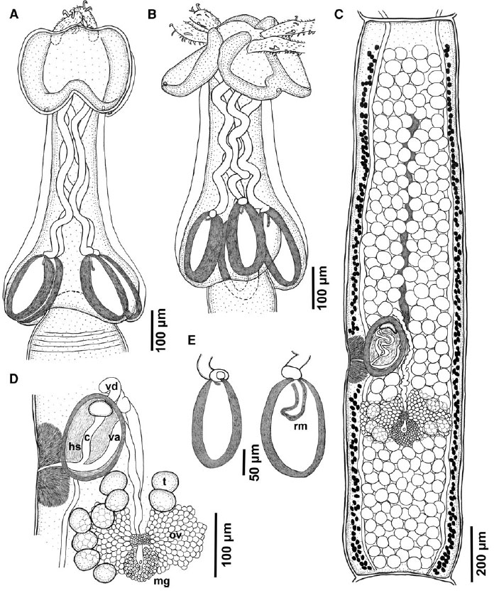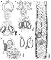 Fig. 4 Otobothrium australe Palm, 2004 from Carcharhinus limbatus in the Indian Ocean. A, scolex, dorso-ventral view; B, scolex, lateral view; C, mature segment; D, detail of terminal genitalia; E, bu... MoreFig. 4 Otobothrium australe Palm, 2004 from Carcharhinus limbatus in the Indian Ocean. A, scolex, dorso-ventral view; B, scolex, lateral view; C, mature segment; D, detail of terminal genitalia; E, bulbs showing retractor muscle originating in anterior region (left) and forming internal loop (right) before originating in anterior region. Abbreviations: c, cirrus; hs, hermaphroditic sac; mg, Mehlis' gland; ov, ovary; rm, retractor muscle; t, testis; va, vagina; vd, vas deferens |