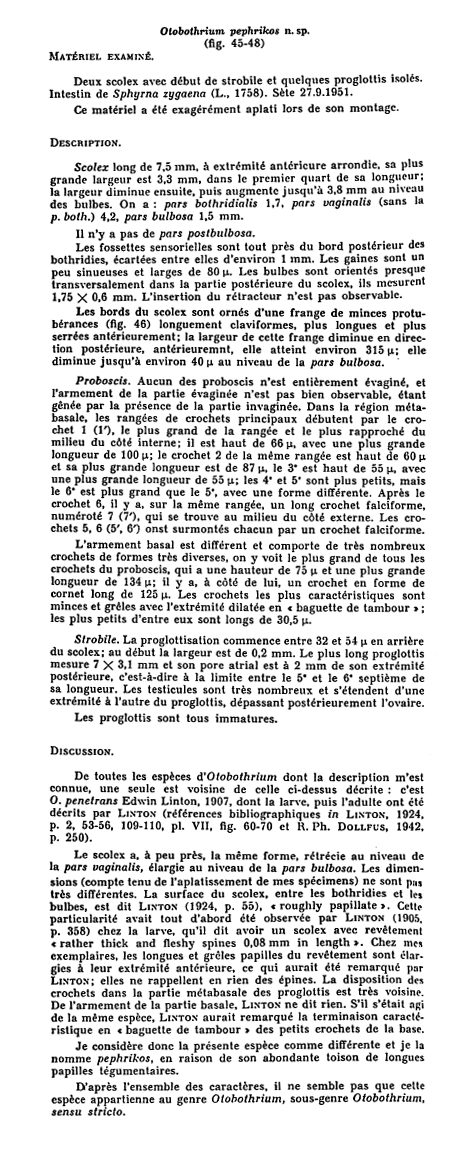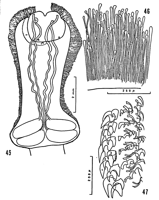FIG. 45. - Otobothrium pephrikos n. sp. de Sphyrna zygaena (L. 1785). Sète, 27.9.1952. Scolex d‘un adulte. FIG. 46. - Revètement de protubérances du scolex du spécimen de la figure 45. FIG. 47. - Armement métabasal. Le còté interne est à gauche.