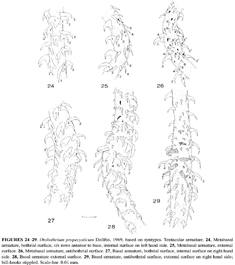 FIGURES 24-29. Otohothrium propecysticum Dollfus, 1969, based on syntypes. Tentacular armature. 24, Metabasal armature, bothrial surface, six rows anterior to base, internal surface on left hand side. 25, Metabasal armature, external surface. 26, Metabasal armature, antibothrial surface. 27, Basal armature, bothrial surface, internal surface on right hand side. 28, Basal armature external surface. 29, Basal armature, antibothrial surface, external surface on right hand side; bill-hooks stippled. Scale-bar: 0.01 mm.