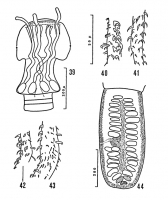FIG. 39. - Otobothrium propecysticum n. sp. adulte de l‘intestin de Sphyrna zygaena (L.). Sète, 27.9.1951. FIG. 40 à 43. - Divers aspects de l‘armement des proboscis. FIG. 44. - Septième proglottis d‘un O. propecysticum n. sp.