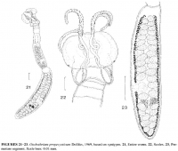 FIGURES 21-23. Otobothriurn propecysticurn Dollfus, 1969, based on syntypes. 21, Entire worm. 22, Seo lex. 23, Premature segment. Scale bars: 0.01 mm.
