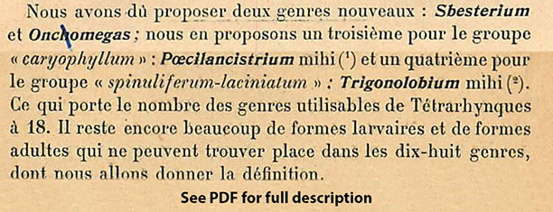 Diesing, K. M. 1850. Systema Helminthum, Vol. I. Wilhelmum Braumüller, Vindobonae [Vienna], 679 pp. (18)Dollfus, R.-P. 1929. Sur les Tetrarhynques. Definition des genres. Bulletin de la Societe Zologique de France 54: 308-342. (4381) Download PDF |