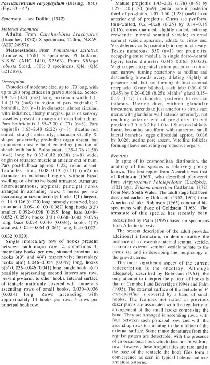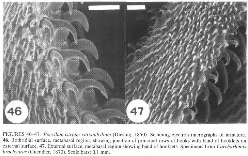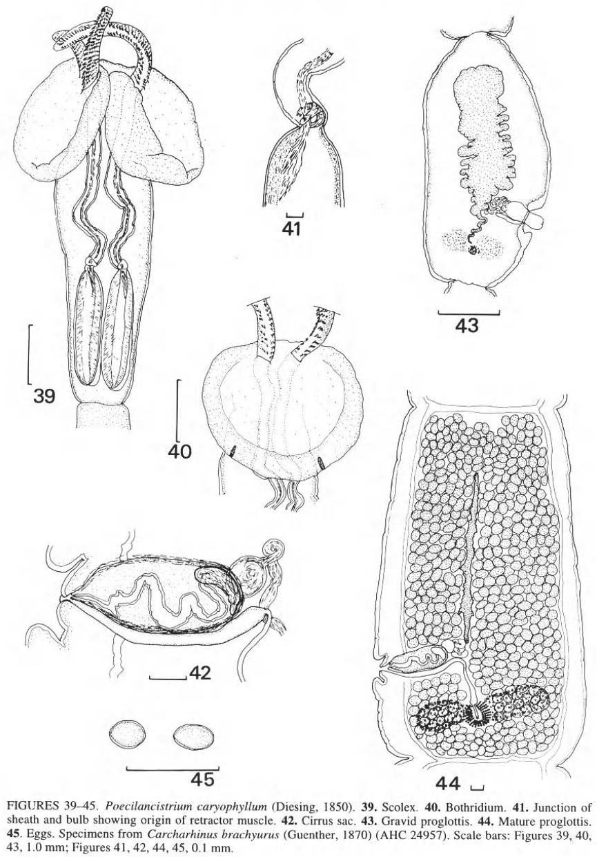 | Host Notes | Additional hosts: Carcharhinus brachyurus, Pomatomus salatrix & Sillago robusta (reported in redescription by Beveridge & Campbell, 1996); Carcharhinus leucas & Negaprion brevirostris (reported in Goldstein, 1962); Glyphis gangeticus; Cynoscion nebulosus (?) |