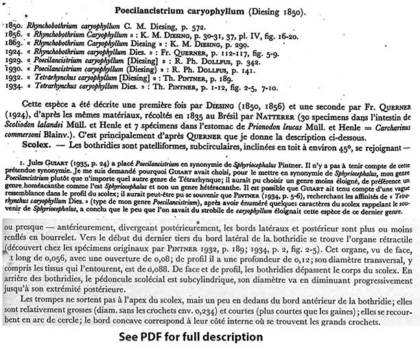 Shipley, A. E. and J. Hornell. 1906. Report on the cestode and nematode parasites from the marine fishes of Ceylon. Report to the Government of Ceylon on the Pearl Oyster Fisheries of the Gulf of Manaar (Herdman), Part 5 5: 43-96. (431) Download PDFDollfus, R.-P. 1942. Études critiques sur les tétrarhynques du Muséum de Paris. Archives du Muséum National d‘Histoire Naturelle, 6. Série 19: 7-466. (170) Download PDF |