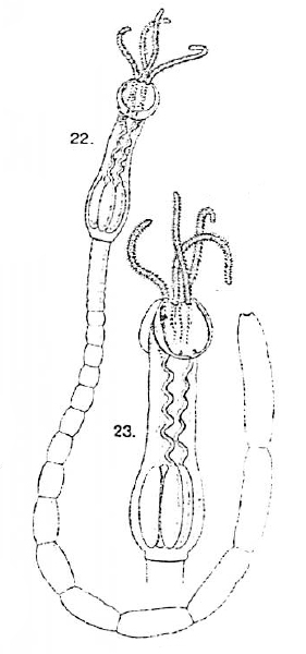 Plate II. Fig. 22. Otobothrium linstowi, n. sp. Entire cestode. x10. Fig. 23. Head of same. x16.