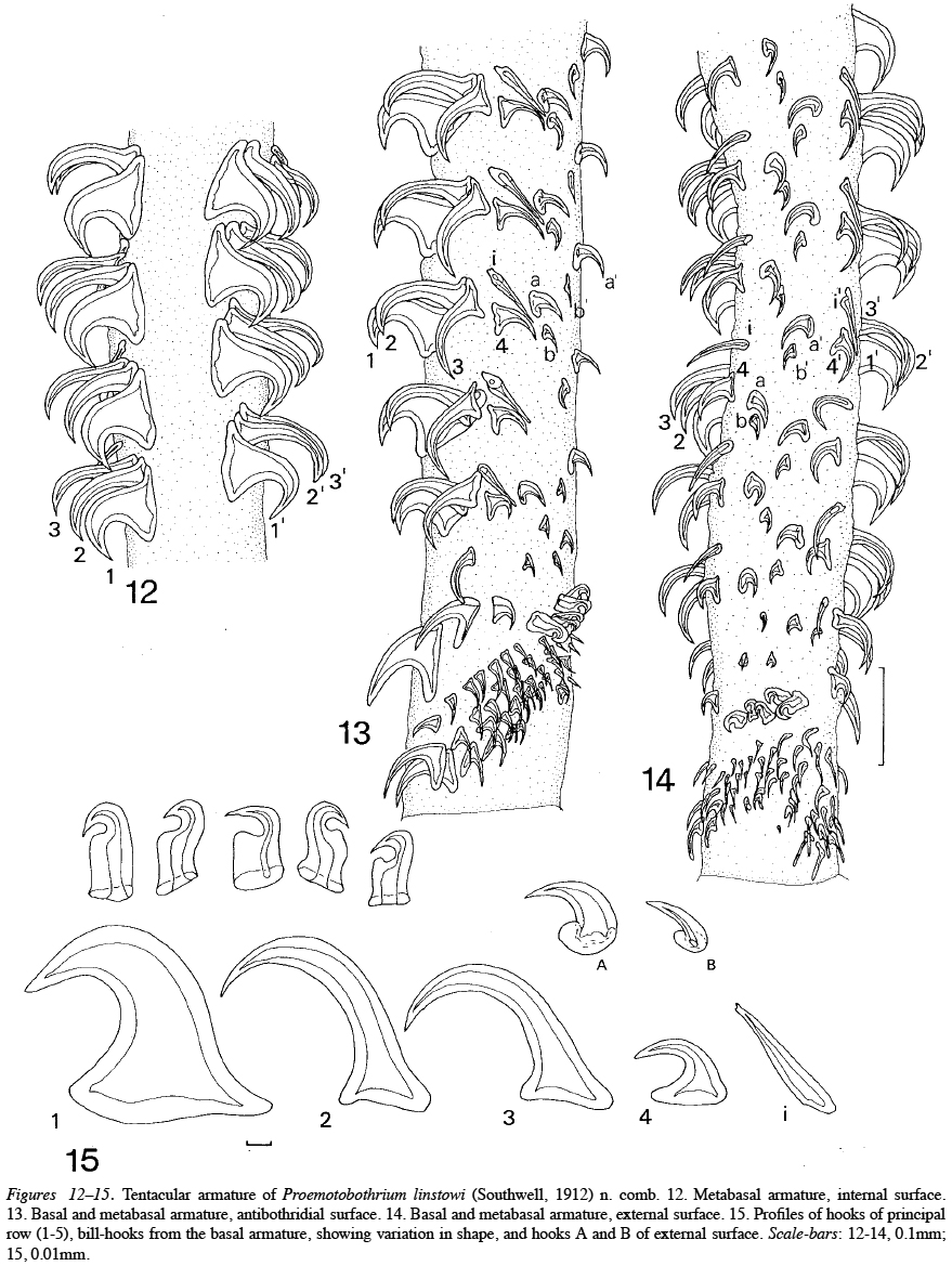 13. Basal and metabasal armature, antibothridial surface. 14. Basal and metabasal armature, external surface. 15. Profiles of hooks of principal