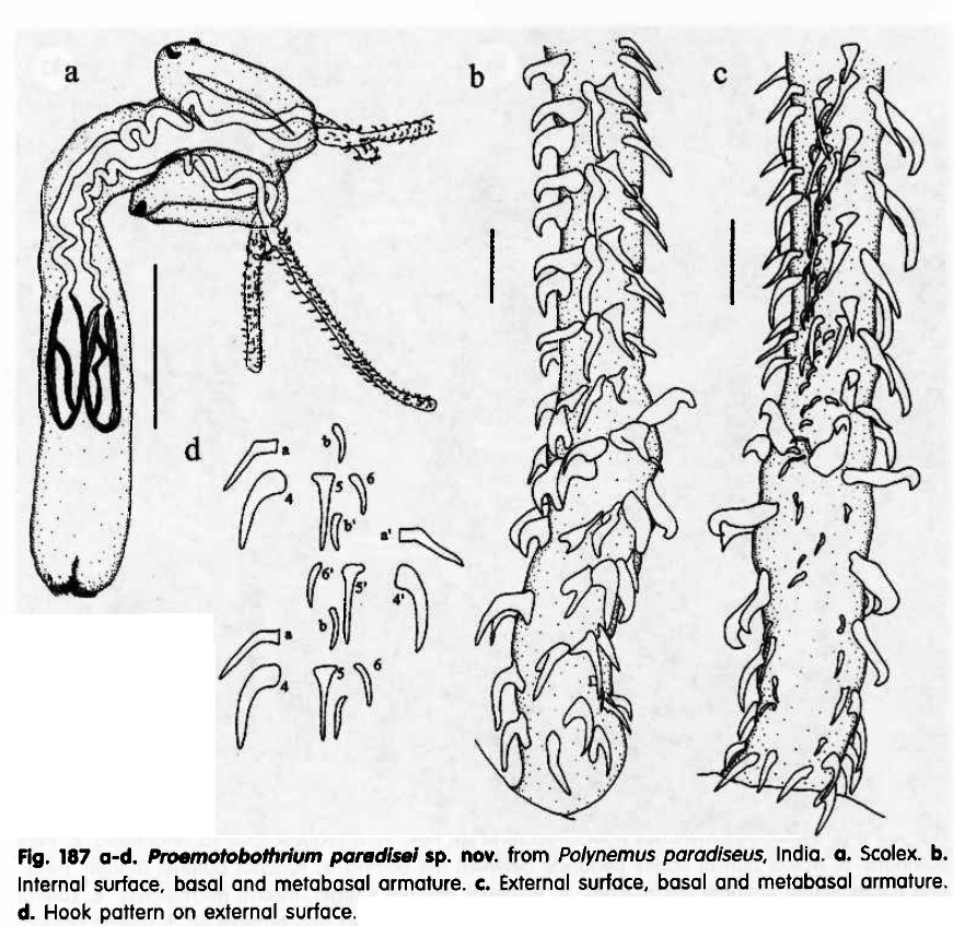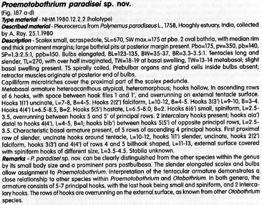 Fig. 187 a-d. Proemotobothrium paradlsei sp. nov. from Polynemus paradiseus, India, a. Scolex. b.