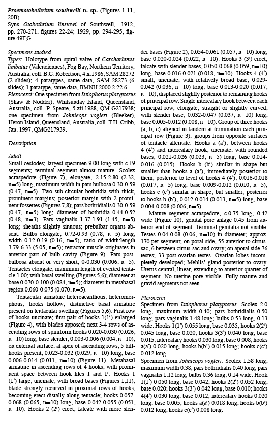 Beveridge, I. and R. A. Campbell. 2001. Proemotobothrium n.g. (Cestoda: Trypanorhyncha) , with the redescription of P. linstowi (Southwell, 1912) n. comb. and the description of P. southwelli n. sp.. Systematic Parasitology 48: 223-233. (4315) Download PDF |